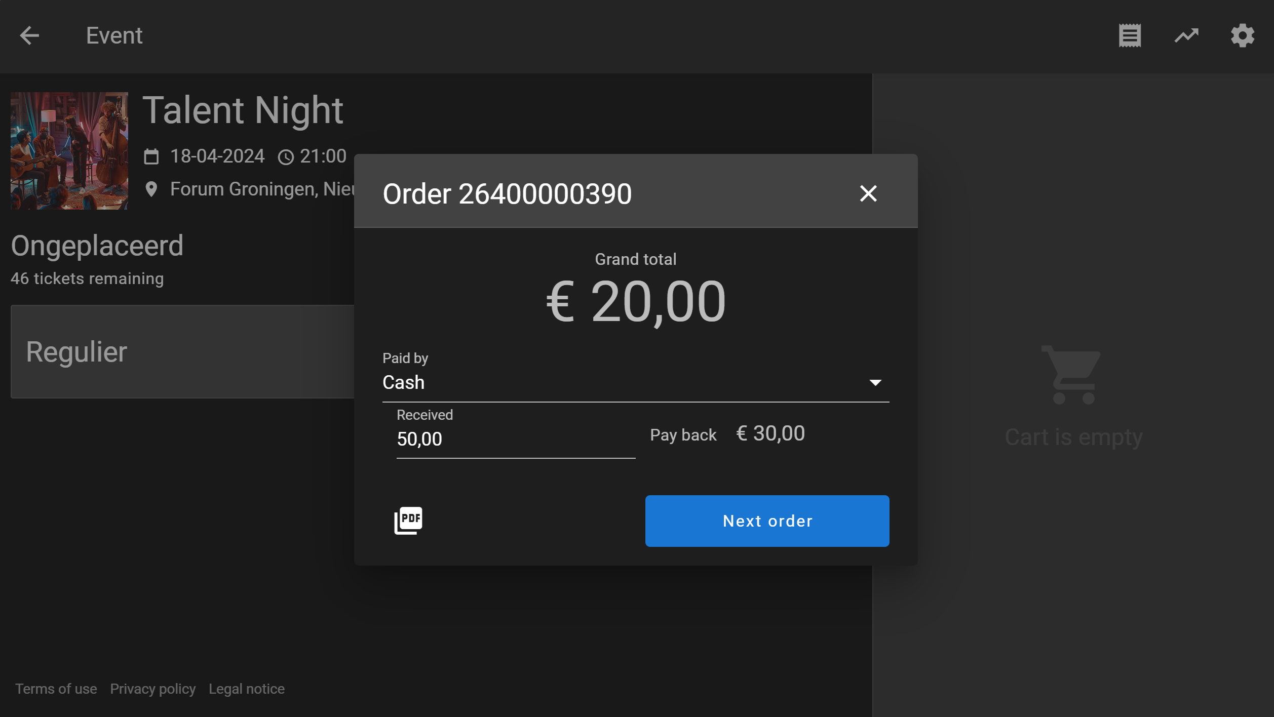The practical order overview gives you an insight into the tickets sold, broken down by seller. You can also use it to make cancellations yourself or re-print sold tickets.