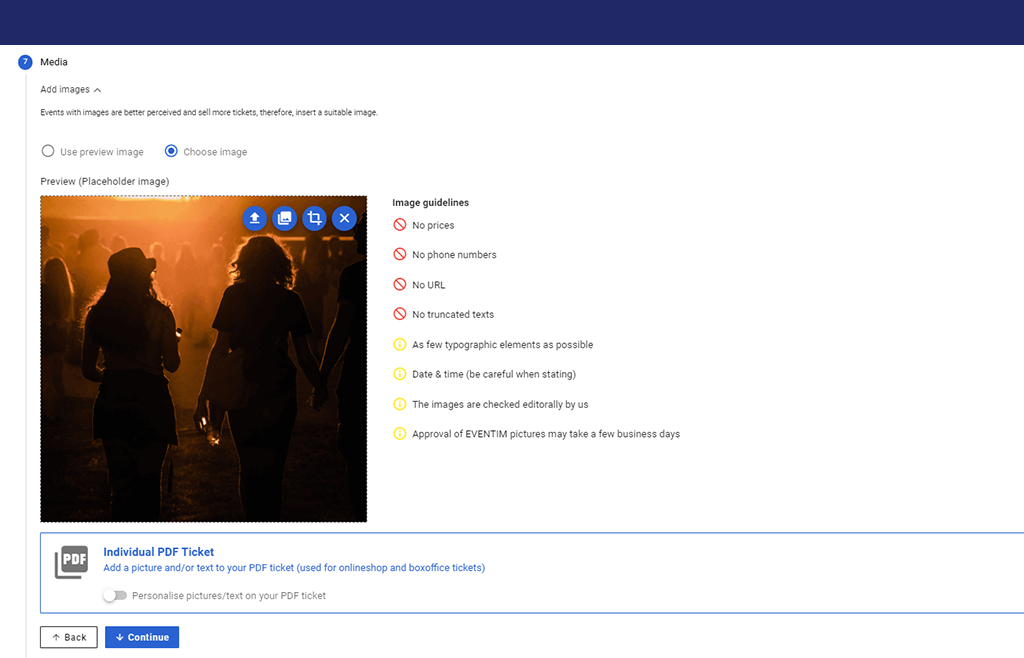 - Optionally, you can customise the layout of your PDF ticket with your images and a personal text.