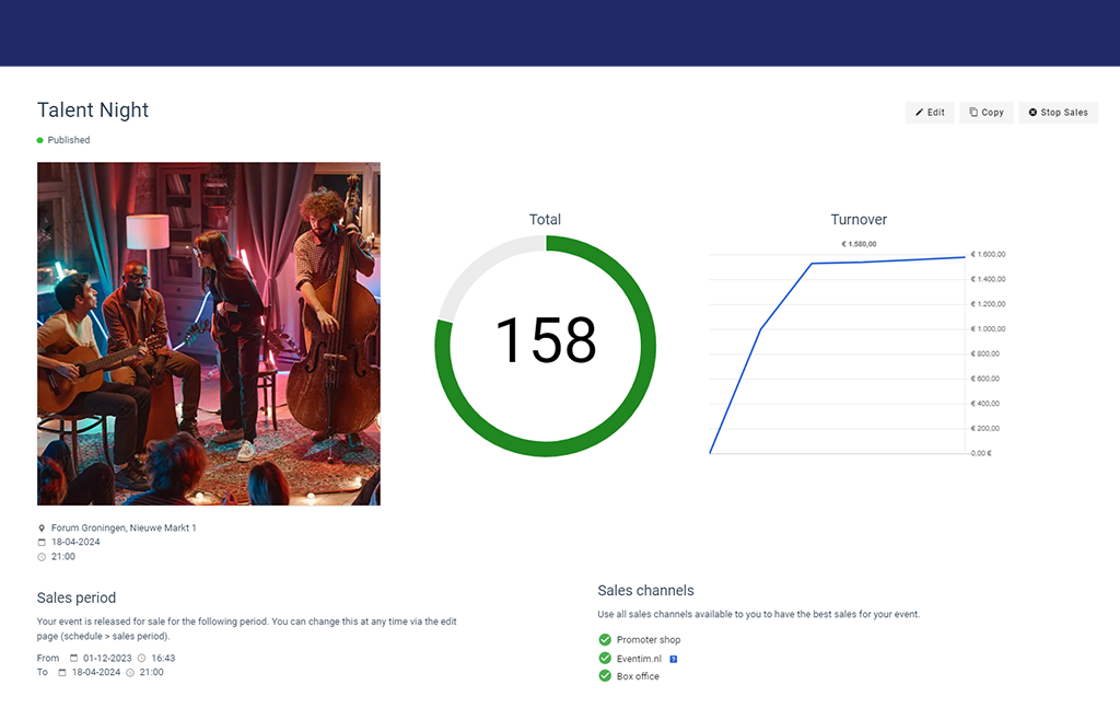 - Open up additional sales channels: By activating the EVENTIM network, you can also sell tickets via eventim.nl with more than 2 million yearly visitors.