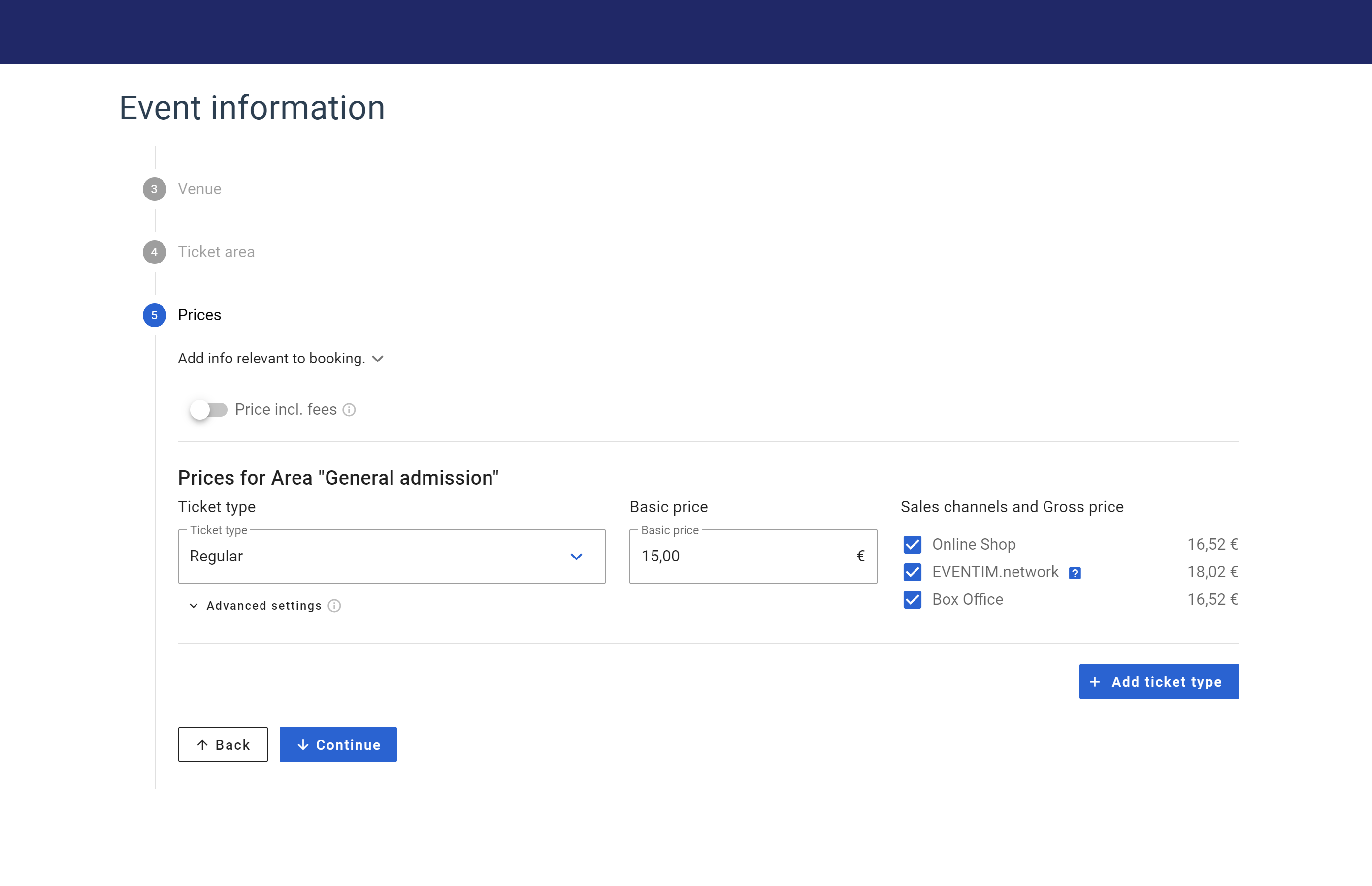 It only takes a few minutes to create your first event. All you need is an EVENTIM.Light account. You will be guided step by step through the event system to define the details of your event and can start selling tickets in your ticket shop immediately.