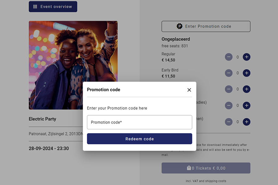 Increase the purchase incentives for potential ticket buyers with promotional campaigns. Reward different groups of buyers and involve advertising partners and multipliers in the marketing of your events.
