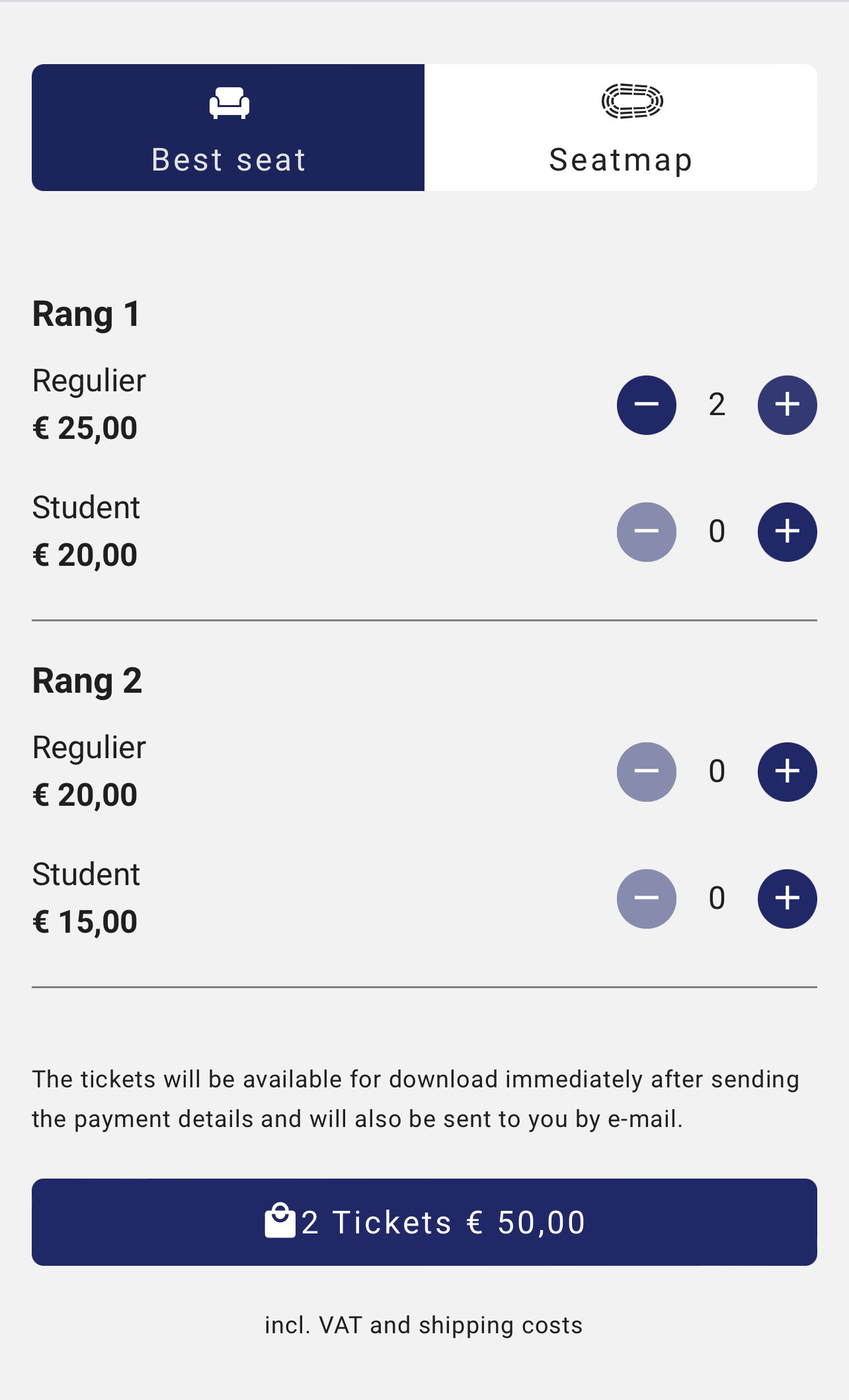 Once created, you can use the seating plan in your own ticket shop as well as in the EVENTIM sales channel with eventim.nl as well as at your own box office. The immediate synchronisation of your ticket sales across all sales channels ensures that the current status of available and already booked seats is displayed at all times.