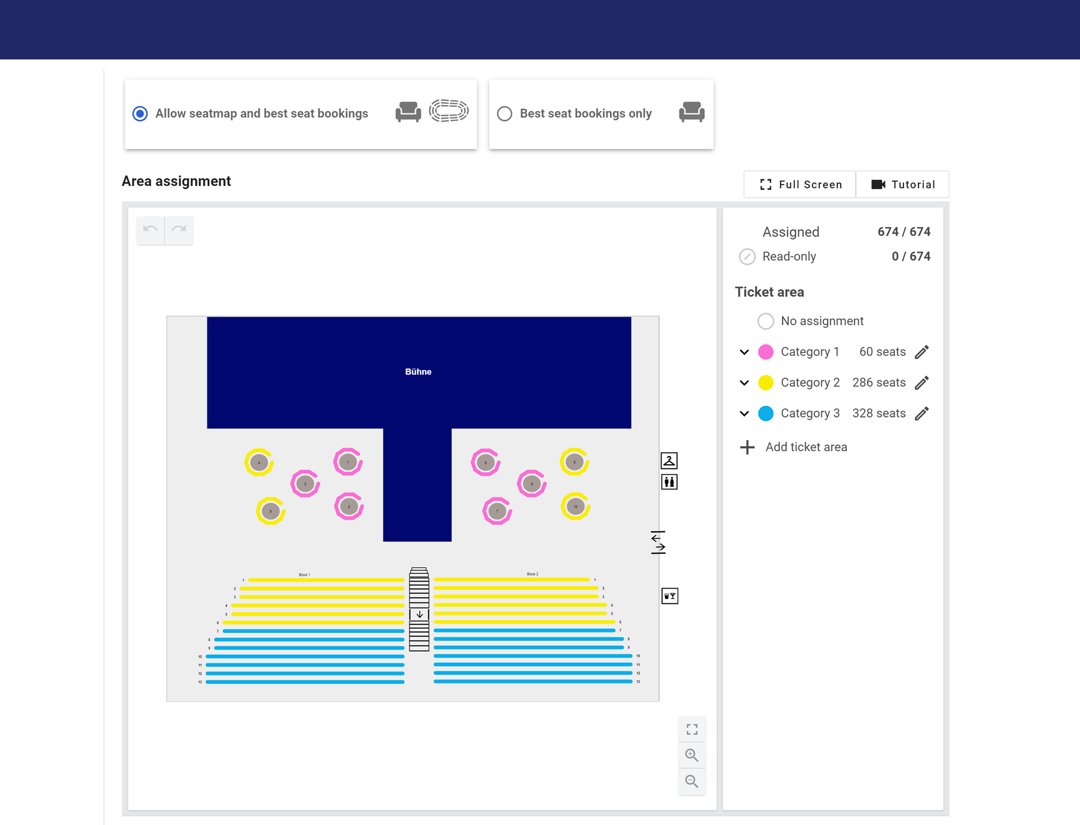 You can offer your ticket buyers either free seat selection via the seating plan, best seat booking or both. When creating your seating plan, you can define the starting point for the automatic calculation of the best seats.