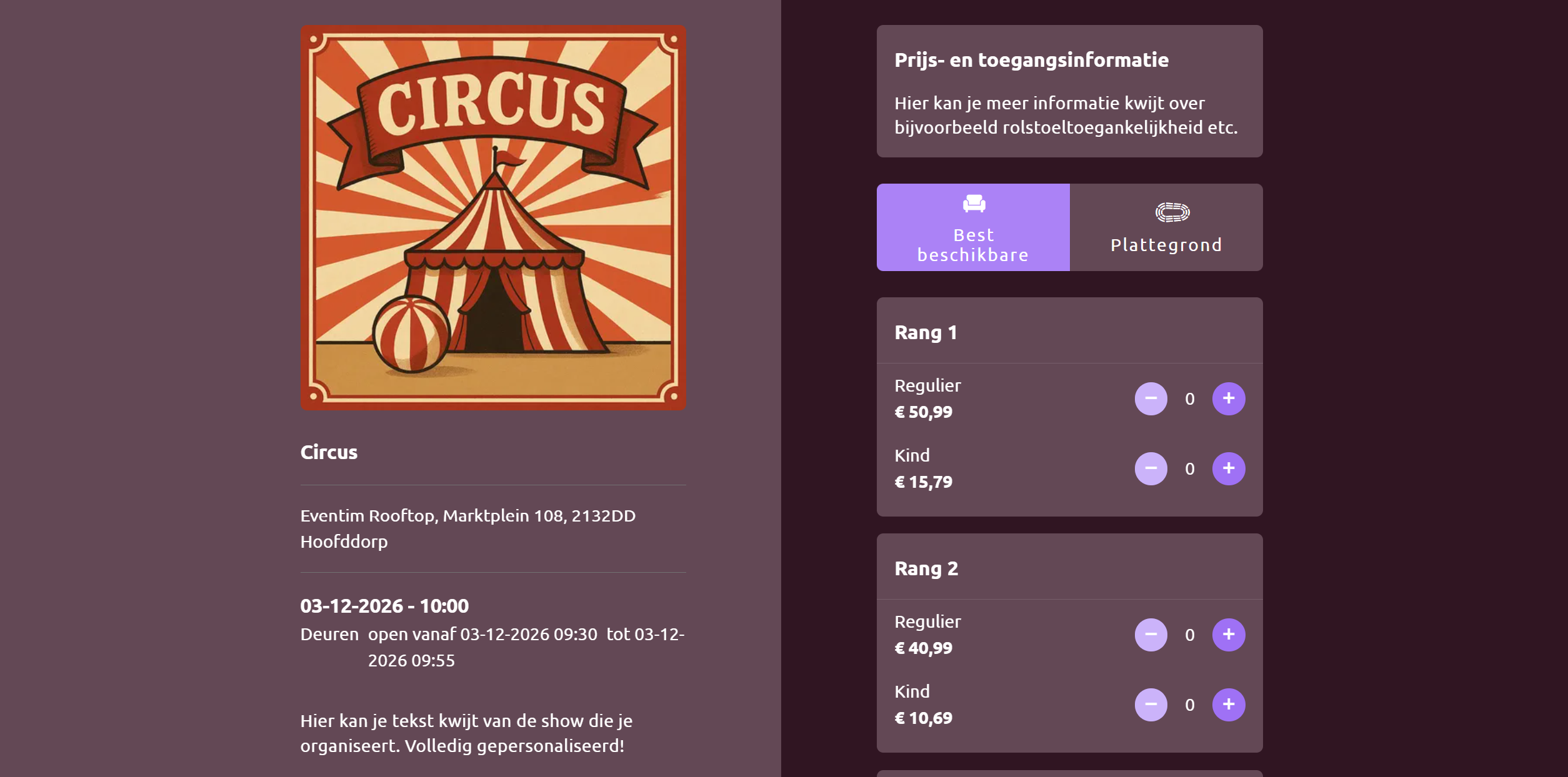 - Tijdsloten en evenementenreeks ideaal voor circussen met meerdere voorstellingen op meerdere dagen, tijden en locaties.