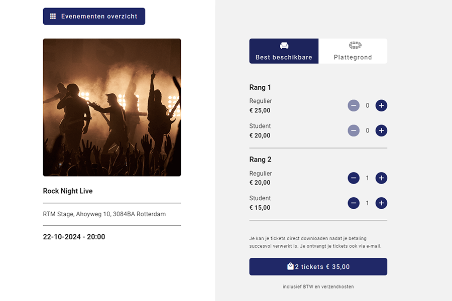 - Maak een plattegrond: Met een optionele plattegrond krijgen jouw concertfans een gevoel bij de locatie en kunnen ze direct de juiste prijscategorie of stoel(en) selecteren.