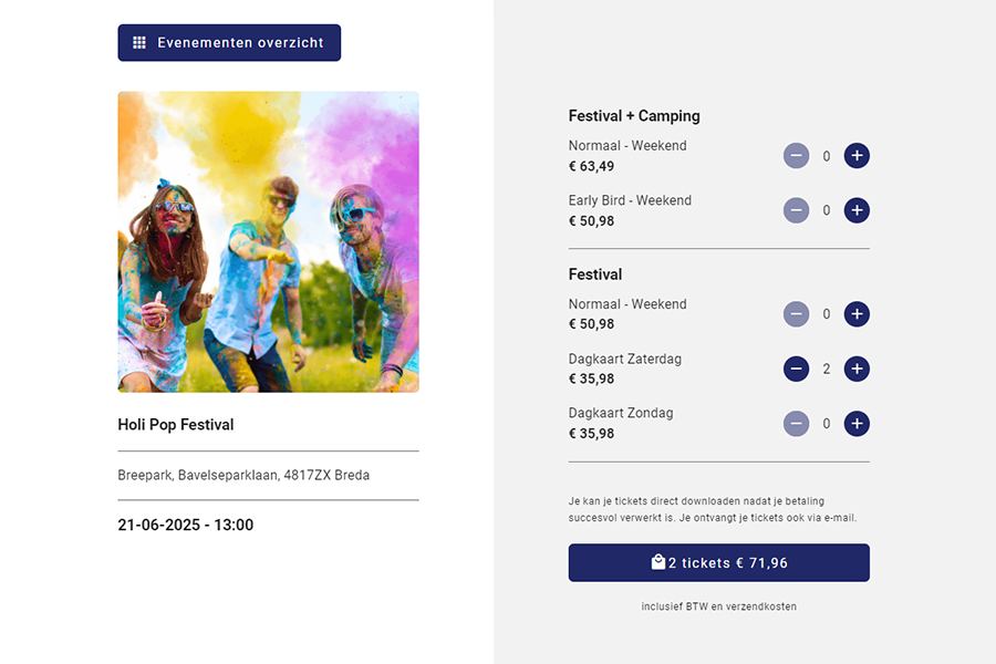 Combineer meerdere eendaagse events als een eventbundel en verkoop het als een weekend- of festivalpas. Op deze manier houd je volledige controle over jouw ticketquotum.