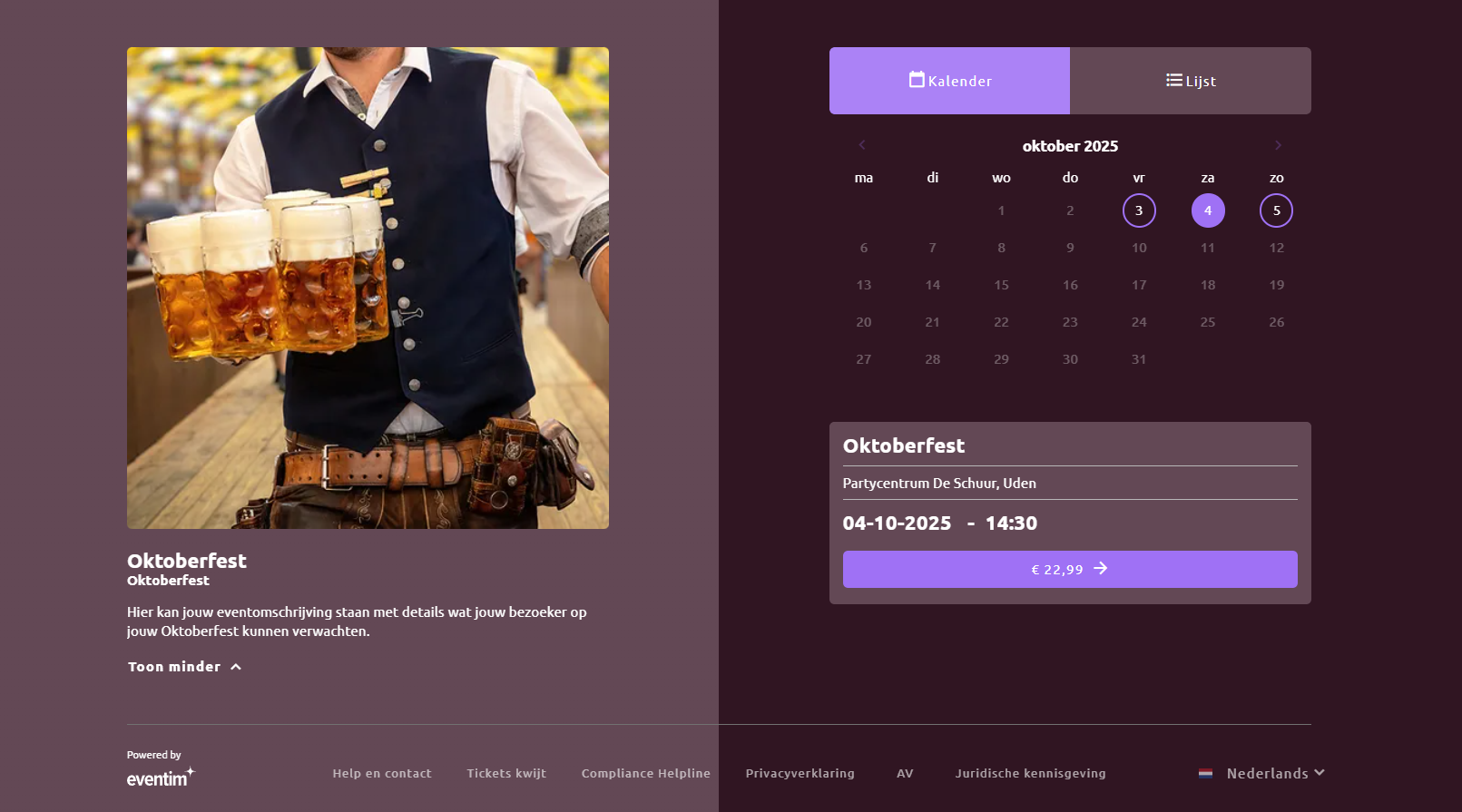 Van biertuinen tot traditionele Wiesn-activiteiten – bezoekers willen in één oogopslag zien welke dagen en tijden beschikbaar zijn en direct hun tickets boeken. Eventim Light helpt je bij een soepele en overzichtelijke ticketverkoop, zodat gasten zonder wachttijd hun feest kunnen beginnen.