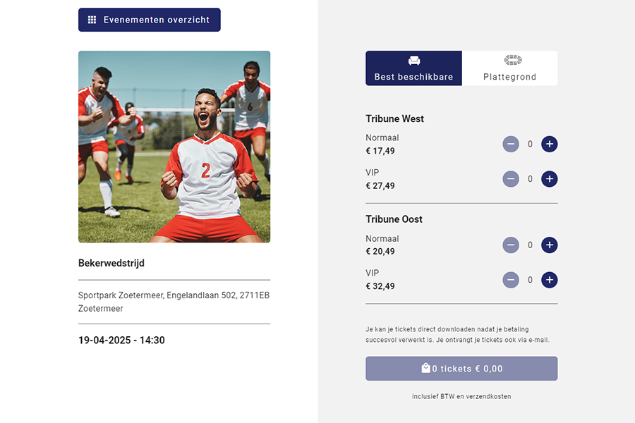 - Plattegrond maken: Met een optioneel te gebruiken plattegrond kunnen fans hun eigen plaatsen selecteren binnen de gewenste prijscategorie.