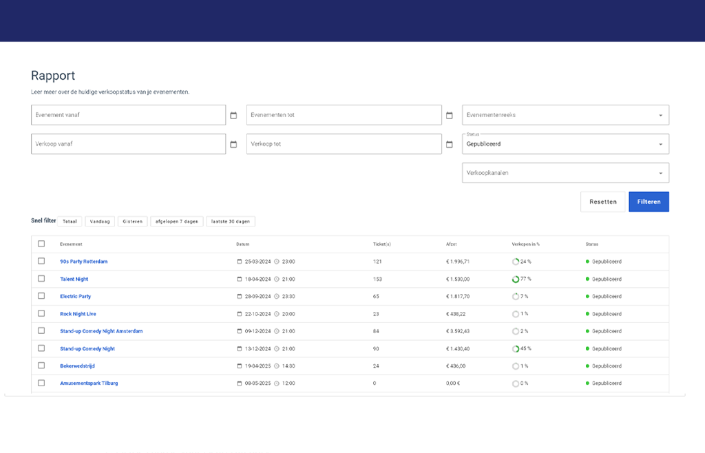De ticketverkoop is gestart en natuurlijk wil je weten hoe de verkoop van jouw event verloopt. In jouw dashboard kun je de meest belangrijke cijfers terugzien in één overzicht zoals de ticketverkoop en omzet. Met Google Analytics analyseer je het gebruikersgedrag en de bezoekersbronnen van je ticketshop. Bovendien kun je door het gebruik van onze ticketscan-app het toelatingsproces achteraf analyseren en optimaliseren voor het volgende event. Daardoor heb je altijd een overzicht in je eventrapportage.
