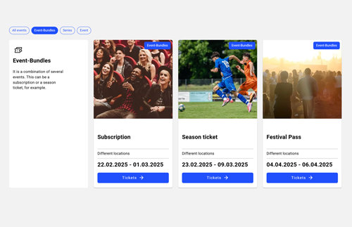 Met eventbundels kun je eenvoudig meerdere losse events als pakket verkopen. Voeg tot 30 losse events of eventdata toe aan jouw eventbundel en verkoop deze als abonnement, seizoenkaart of festivalpas. De eventbundel heeft toegang tot dezelfde ticketaantallen als de losse events. Bepaal zelf of jouw bundel een vaste set events bevat of dat je kopers zelf de data kunnen kiezen.