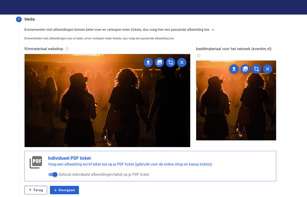 - Optioneel kun je de layout van jouw PDF-tickets met jouw afbeeldingen en een persoonlijke tekst customizen.