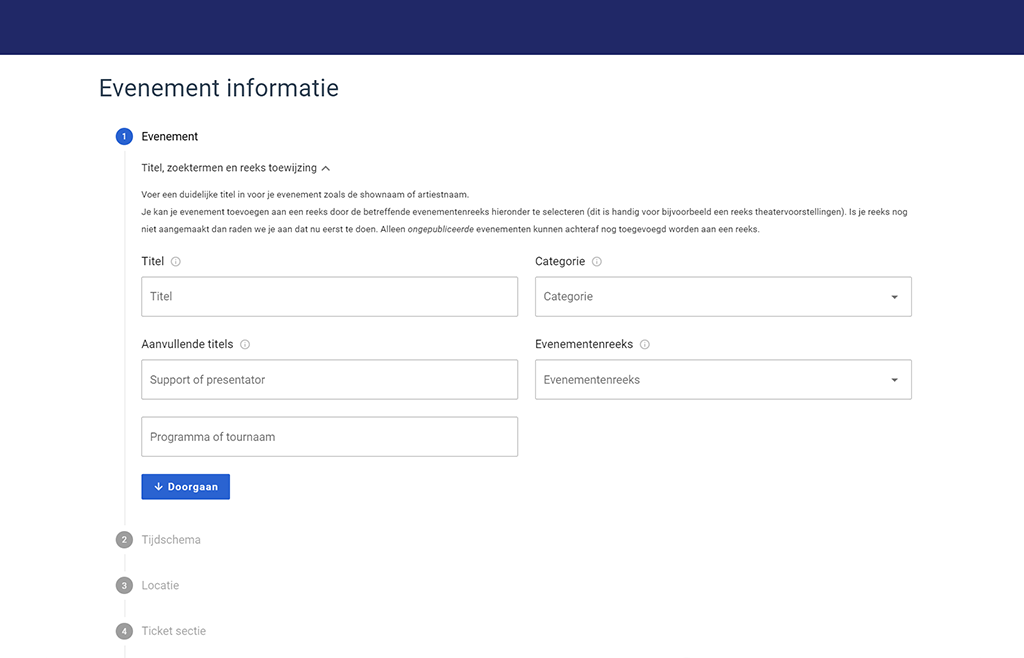 - Selecteer de bijpassende categorie voor jouw evenement en bepaal of het een eenmalig evenement of een evenementreeks is.